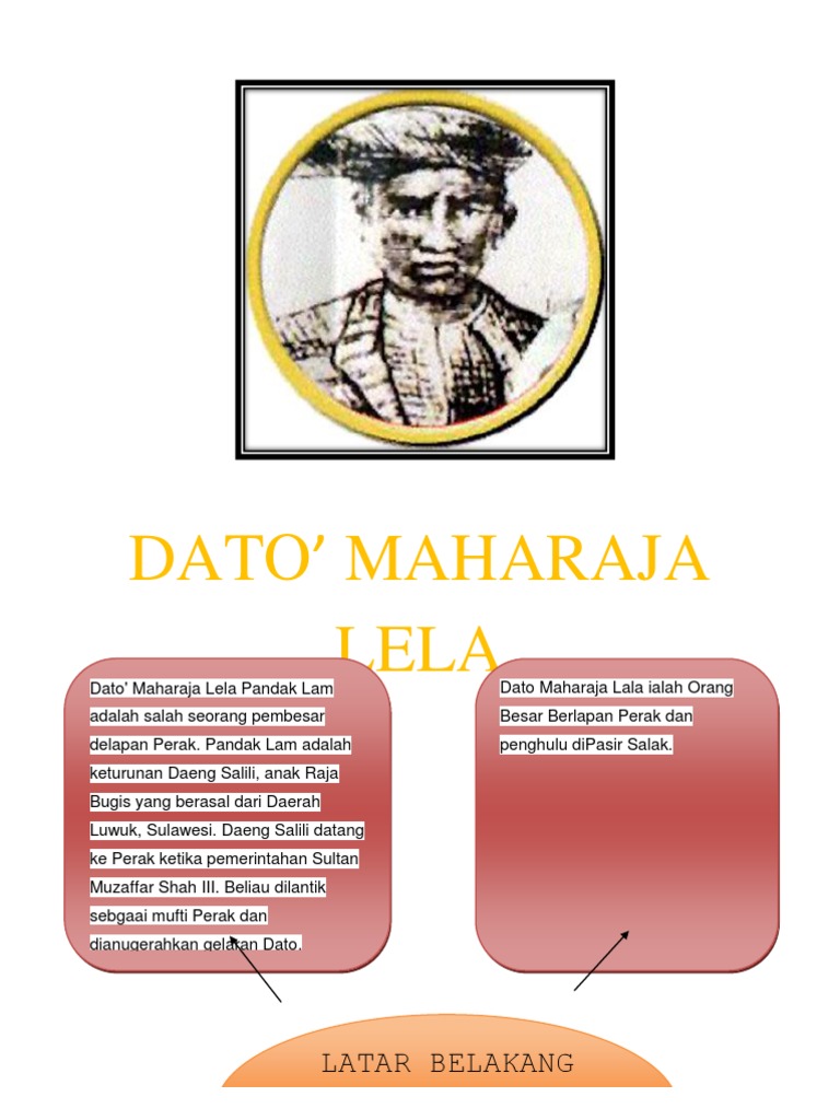 Sejarah Odt from imgv2-2-f.scribdassets.com Dato' maharaja lela ialah pembesar kelapan perak yang merupakan pejuang bangsa yang bertanggungjawab kepada sumpah dan janjinya. Sk dato' maharaja lela terletak di kawasan luar bandar dan mempunyai bilangan guru sebanyak 106 orang dan bilangan murid sebanyak 1498 orang. Perjuangan dato' maharajalela pandak lam menentang british merupakan satu perjuangan yang suci dan murni. Beliau berketurunan daeng selili, anak raja bugis yang berasal dari daerah luwuk, sulawesi. V dato' maharaja lela dan seputum telah membunuh j.w.w. Pasir salak cukup sinonim dengan kisah sejarah kebangkitan orang. Pada paragraf ini, peneliti menyampaikan permasalahan penelitiannya. Genealogy for dato seri maharaja lela abu bakar (b.