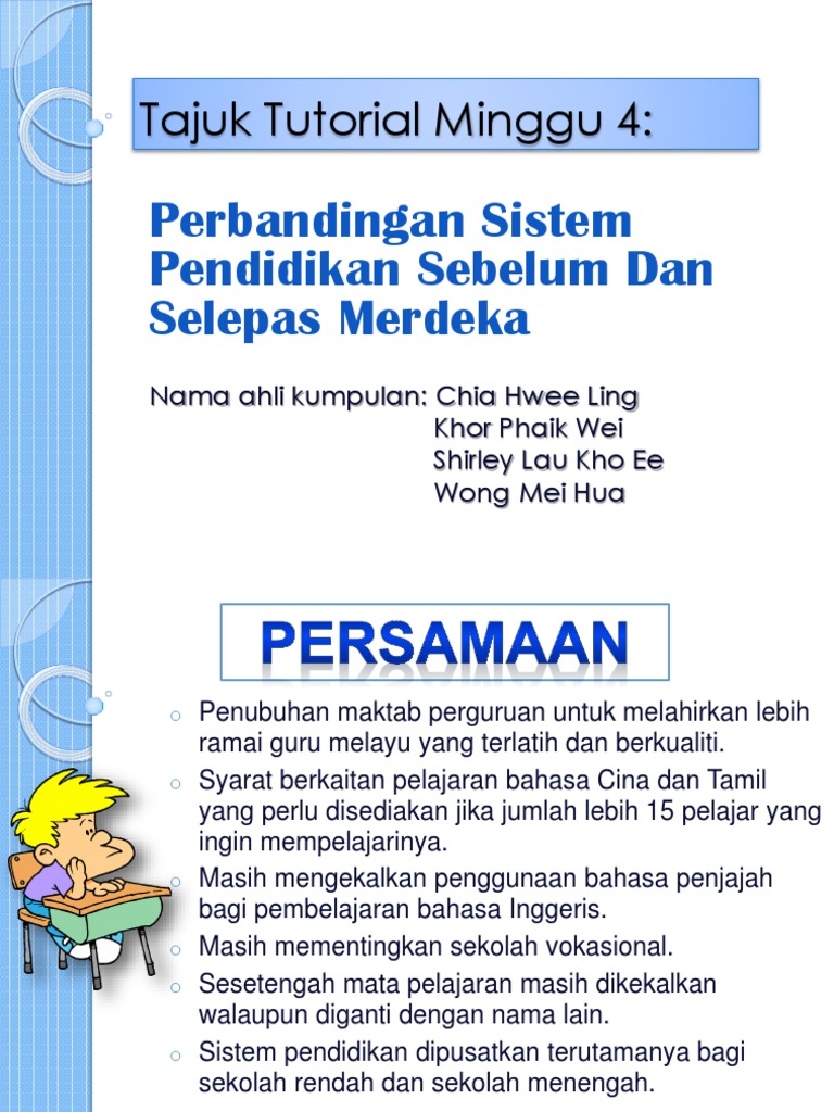 ( a ) lee siew lian a157886( b ) low mei fong a161735( c ) lim zhan huan a158884( d )tan ching kang a1615. Sistem ini telah dikawal sepenuhnya oleh pihak penjajah inggeris. Perkembangan sistem pendidikan selepas merdeka terbahagi kepada tiga tahap iaitu tahap pertama 1963 1965 tahap kedua 1966 1970 dan tahap ketiga 1971 1975. Sistem pendidikan malaysai selepas merdekalaporan/penyata razakantara tujuan utama laporan.1. Tahap pertama merupakan tahap perlaksanaan rancangan sistem pendidikan yang telah dikuatkuasakan dalam akta pelajaran 1961.